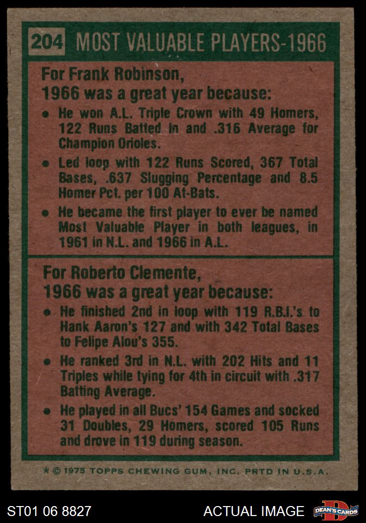 1975 Topps #204 - Frank Robinson / Roberto Clemente 1966 MVPs 6 - EX/MT