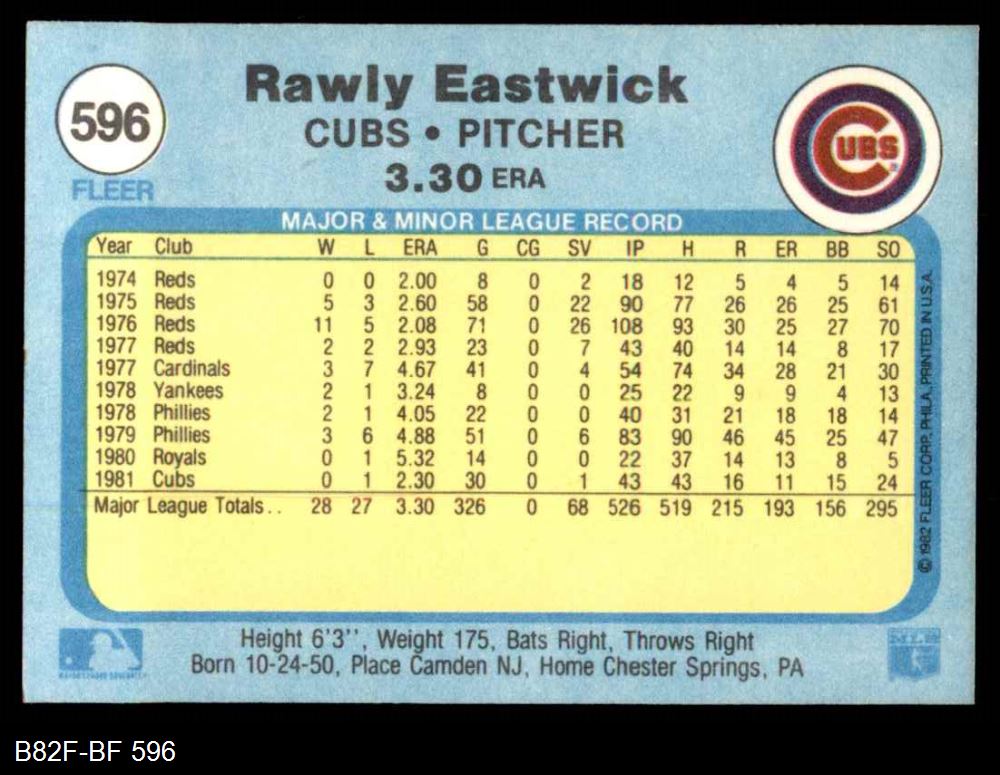 1982 Fleer #596 Rawly Eastwick 8 - NM/MT