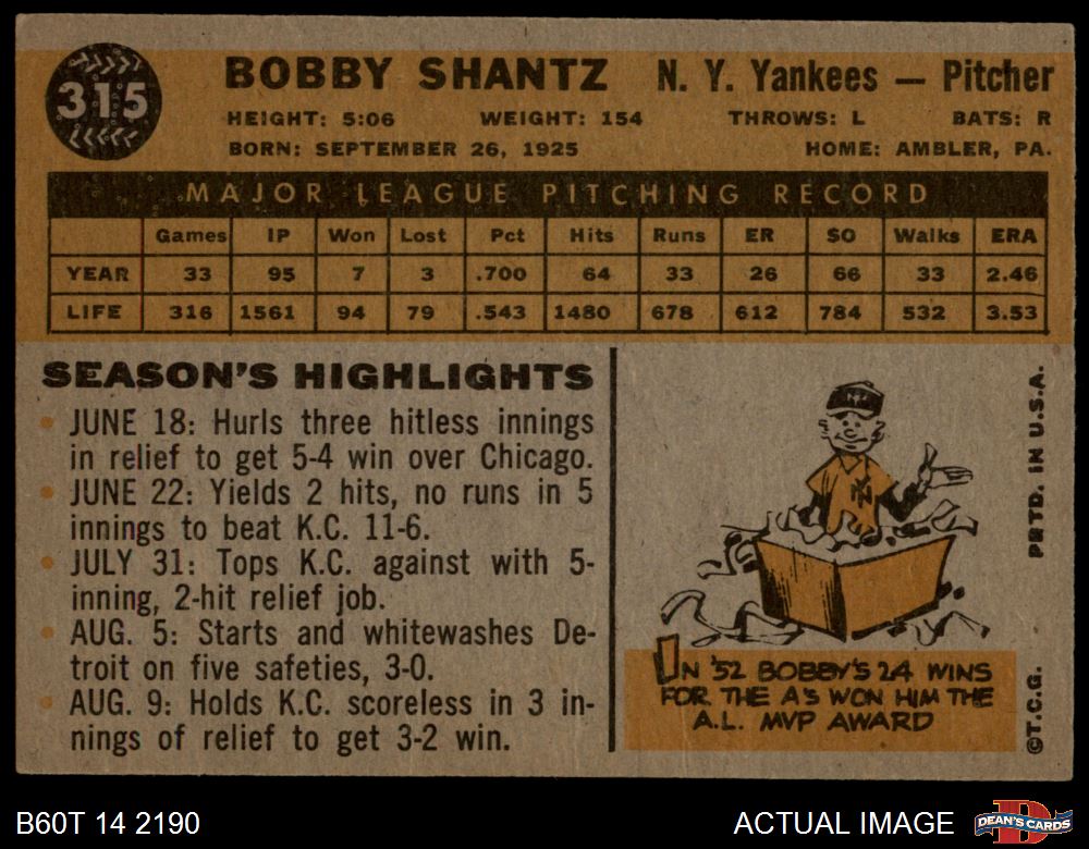 1960 Topps #315 Bobby Shantz 1.5 - FAIR