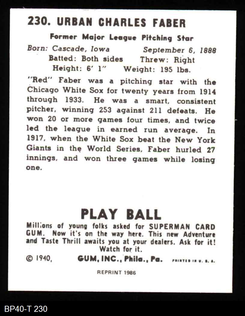 1940 Play Ball Reprint #230 Red Faber 8 - NM/MT