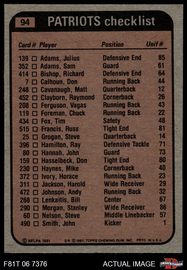 1981 Topps #94 - Vagas Ferguson / Stanley Morgan / Raymond Clayborn / Julius Adams Patriots Leaders & Checklist 5 - EX