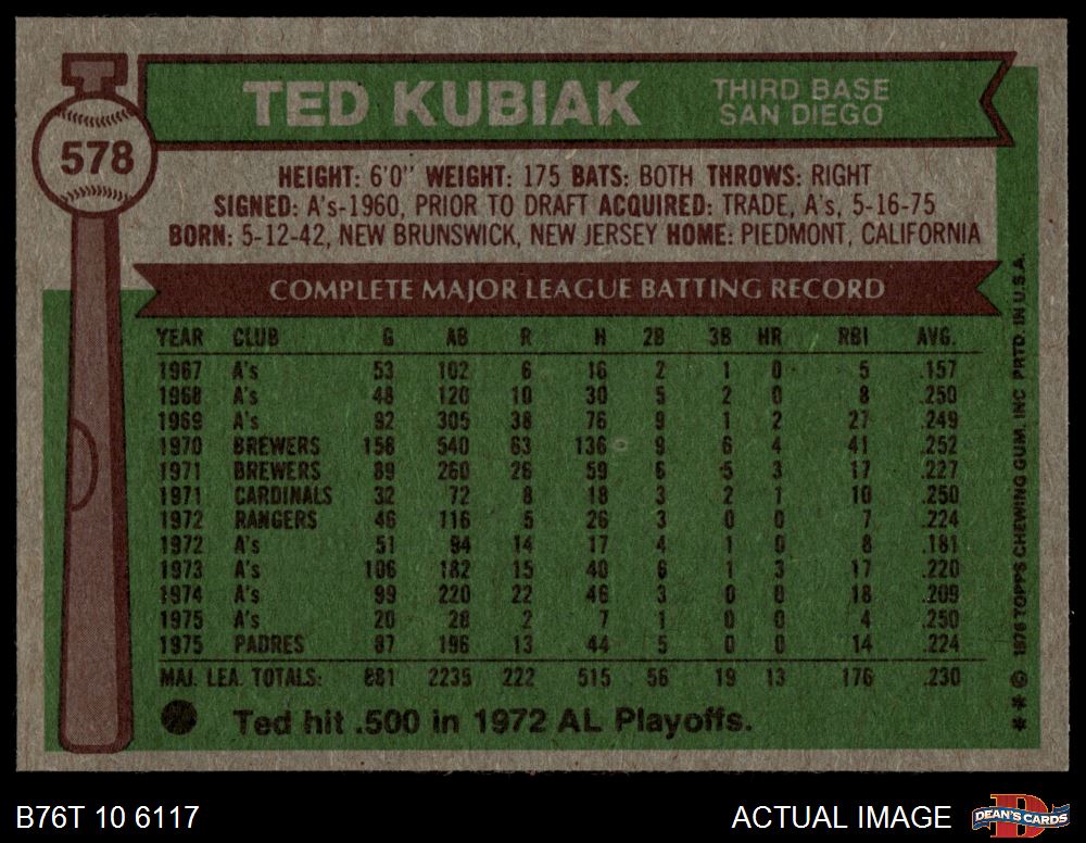 1976 Topps #578 Ted Kubiak 7 - NM