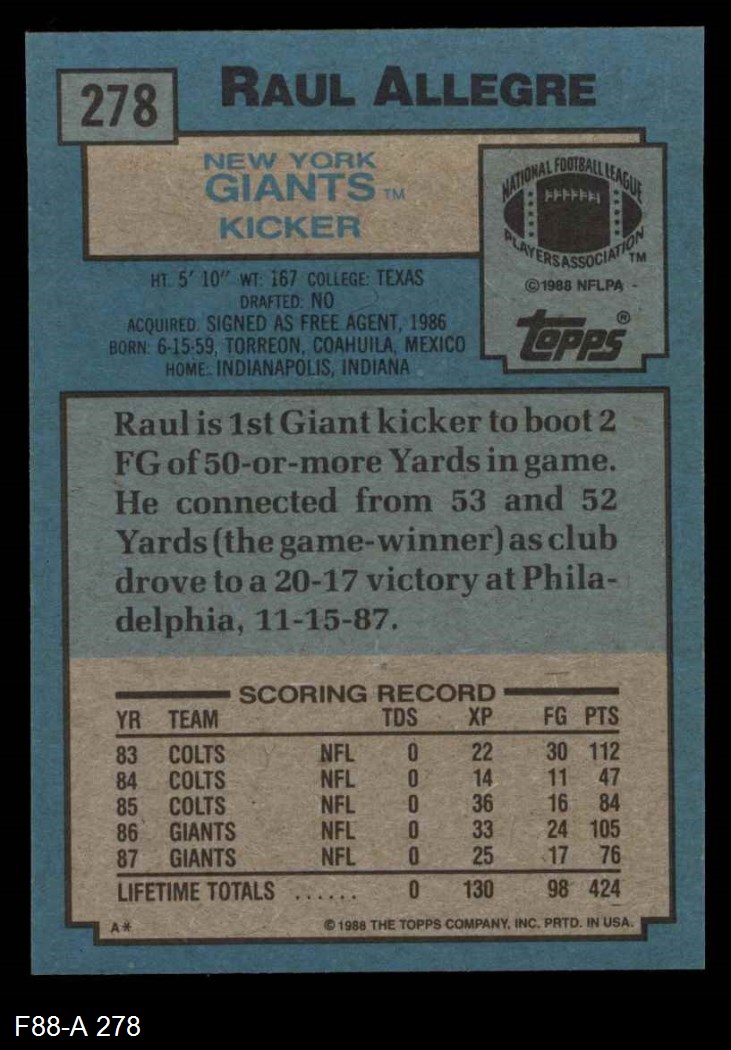 1988 Topps #278 Raul Allegre 8 - NM/MT