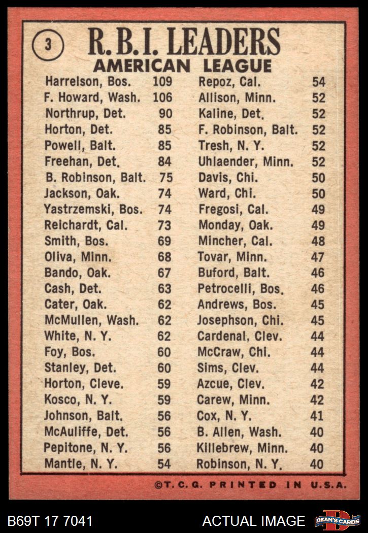 1969 Topps #3 - Ken Harrelson / Frank Howard / Jim Northrup AL RBI Leaders 6.5 - EX/MT+