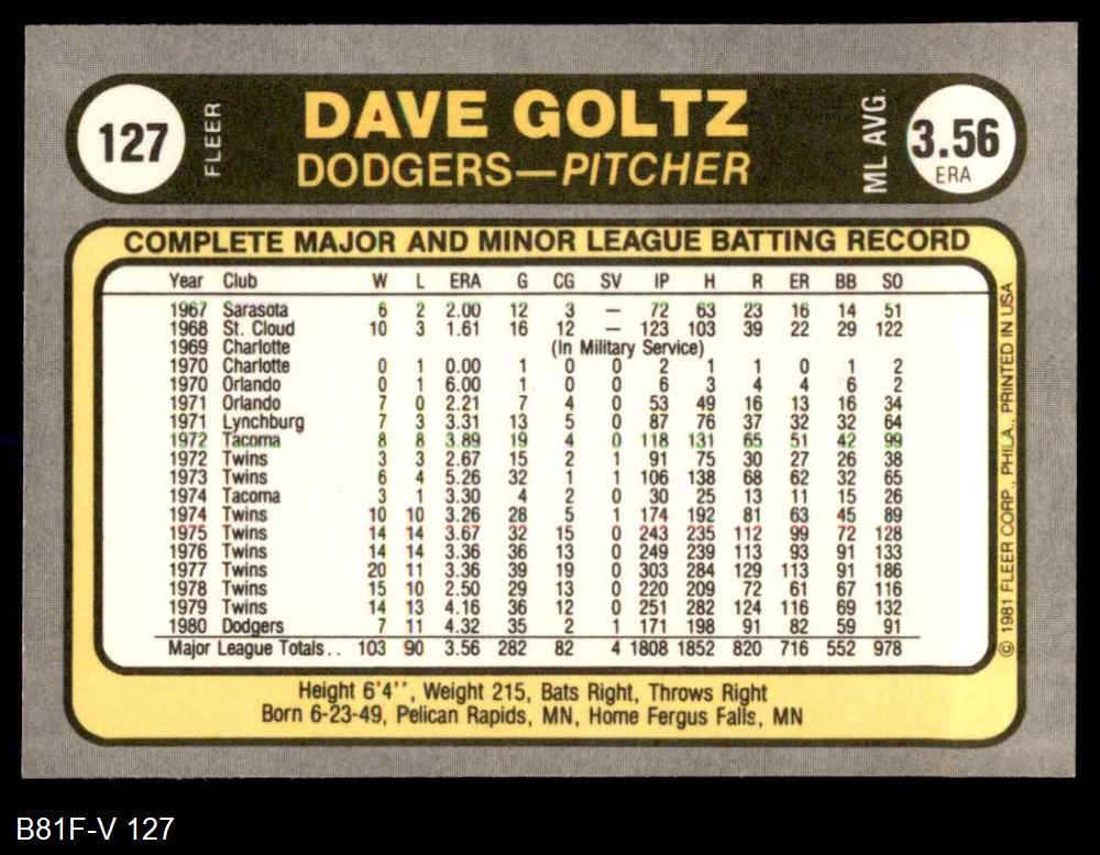 1981 Fleer #127 Dave Goltz 8 - NM/MT