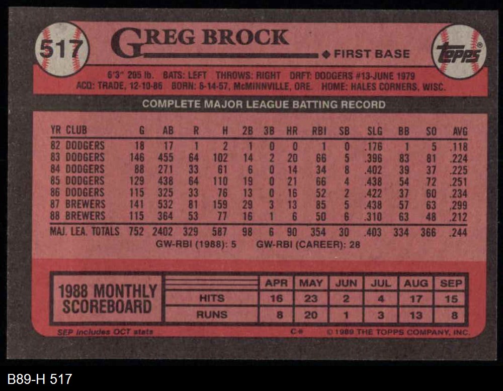 1989 Topps #517 Greg Brock 8 - NM/MT