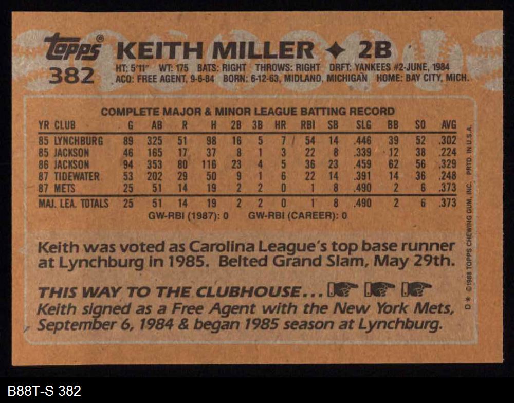 1988 Topps #382 Keith Miller 8 - NM/MT
