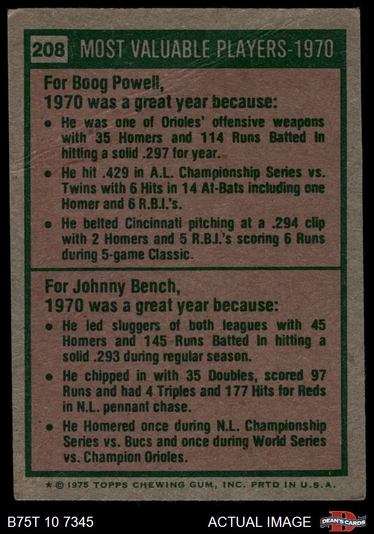 1975 Topps #208 - Johnny Bench / Boog Powell 1970 MVPs 1.5 - FAIR