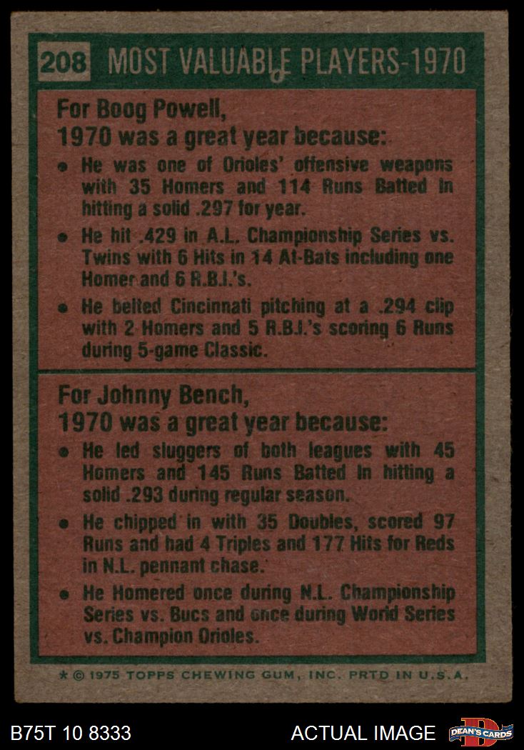1975 Topps #208 - Johnny Bench / Boog Powell 1970 MVPs 4.5 - VG/EX+