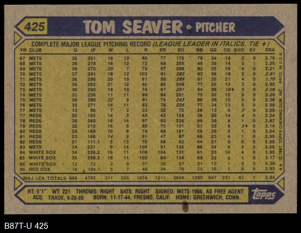 1987 Topps #425 Tom Seaver 8 - NM/MT