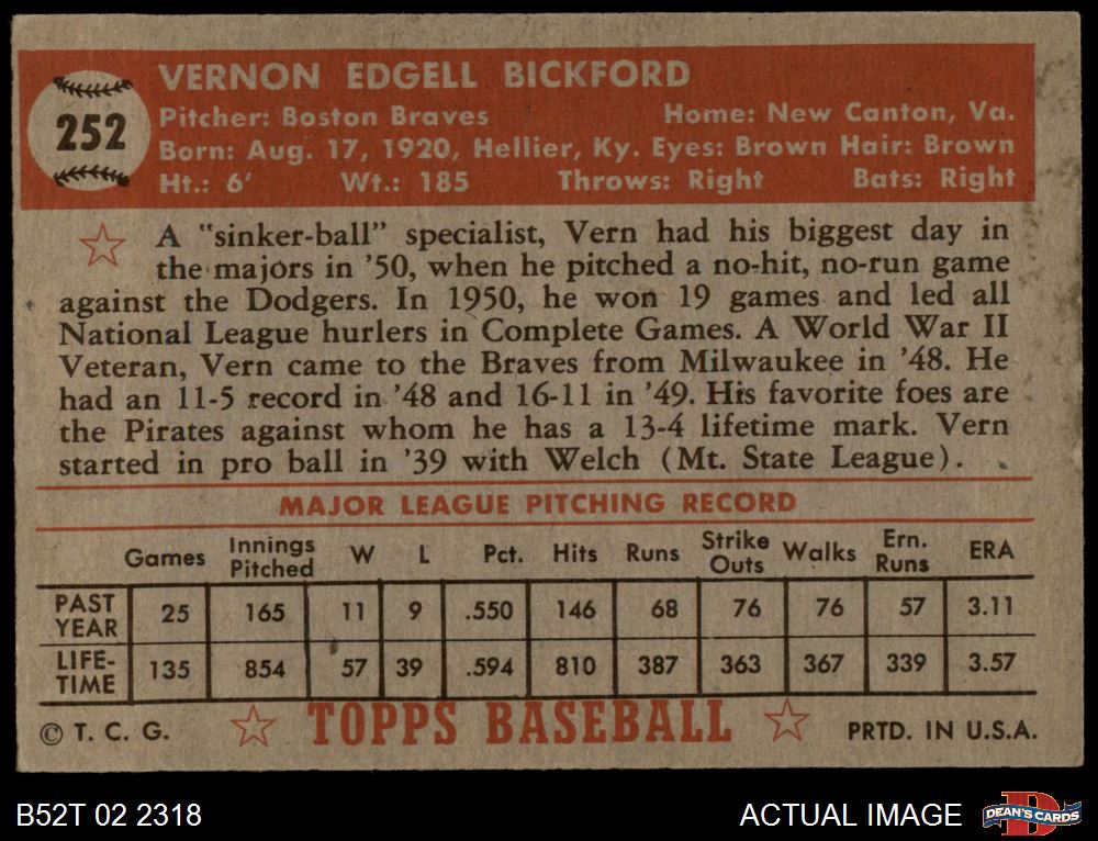 1952 Topps #252 Vern Bickford 1 - POOR
