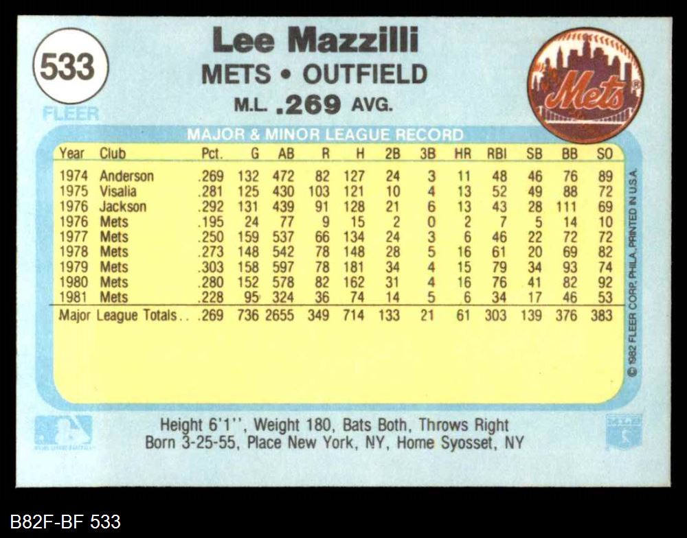 1982 Fleer #533 Lee Mazzilli 8 - NM/MT