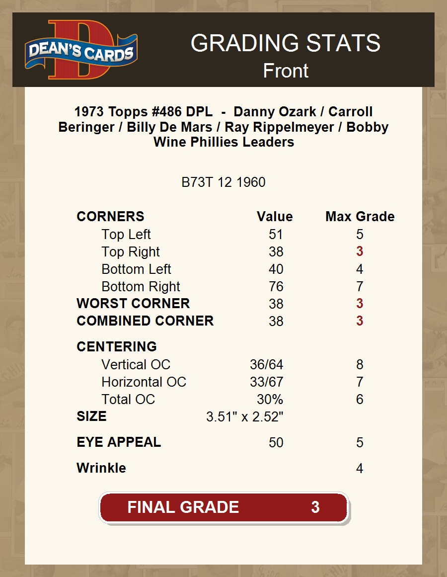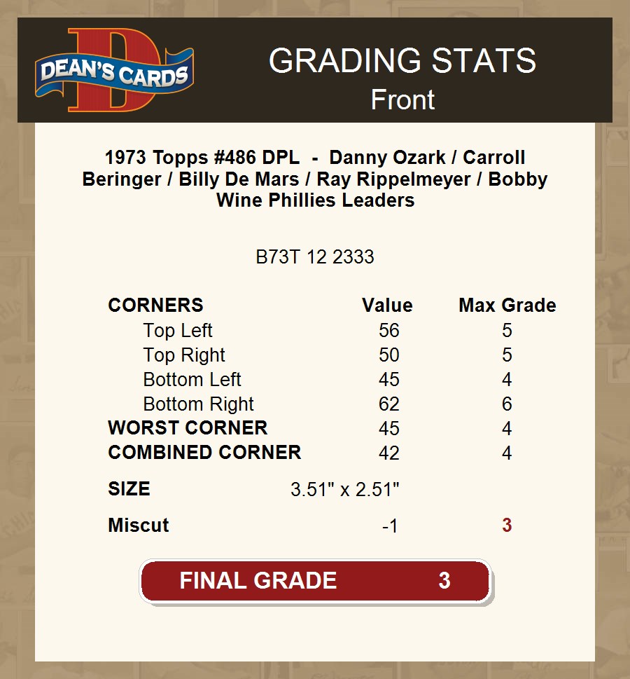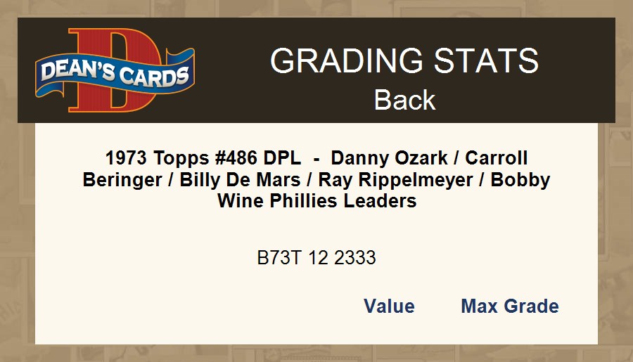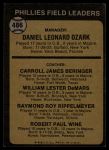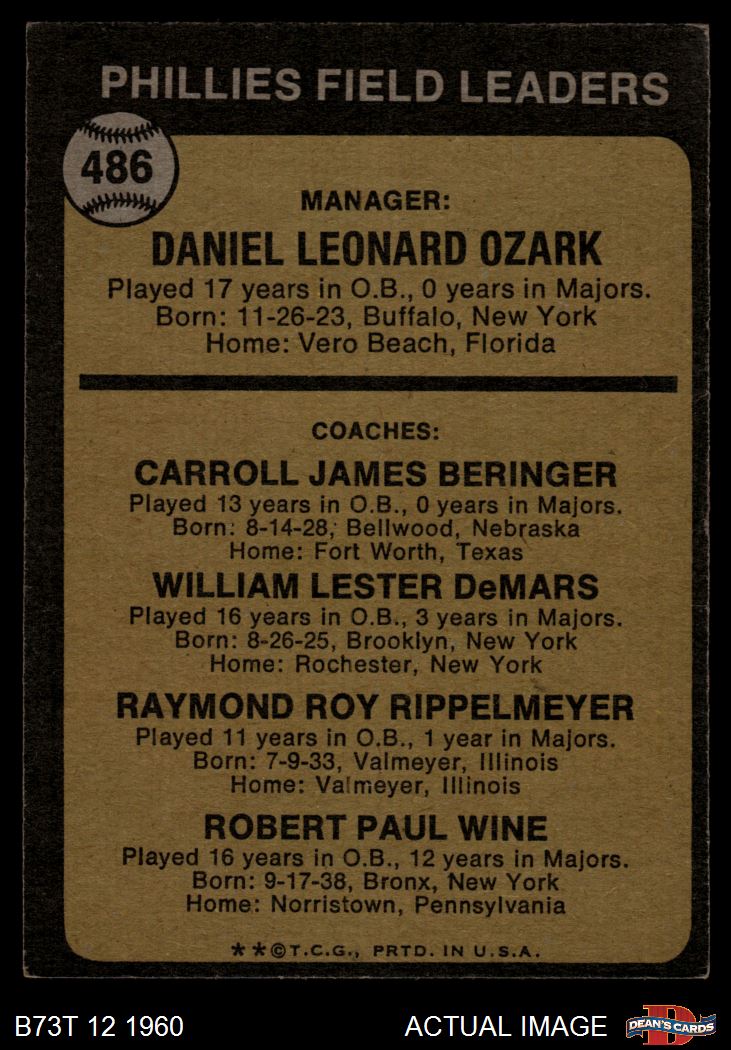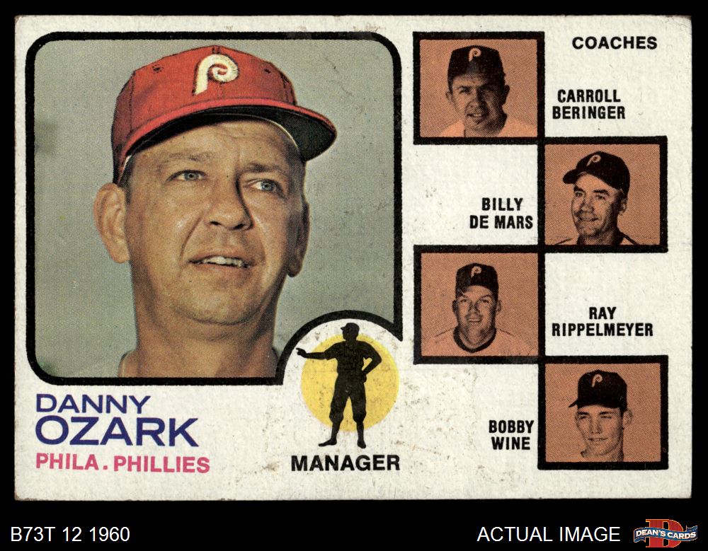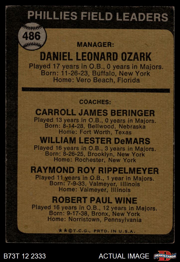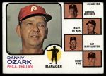 1973 Topps #486 DPL - Danny Ozark / Carroll Beringer / Billy De Mars / Ray Rippelmeyer / Bobby Wine Phillies Leaders 3 - VG