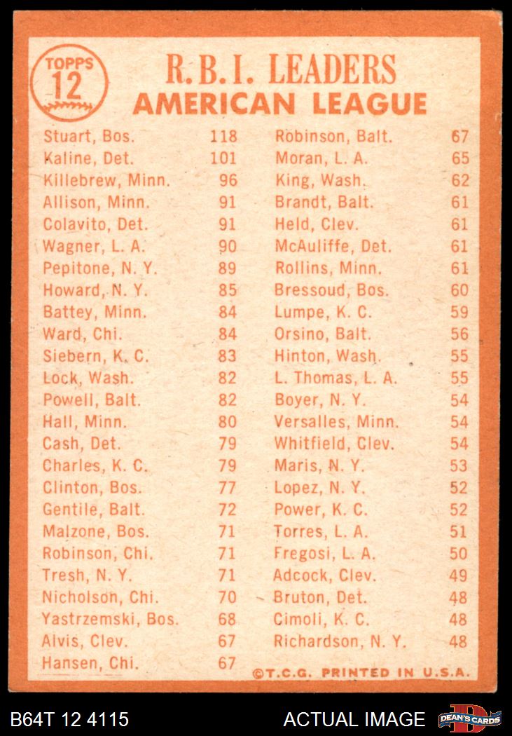 1964 Topps #12 - Al Kaline / Harmon Killebrew / Dick Stuart AL RBI Leaders 4 - VG/EX