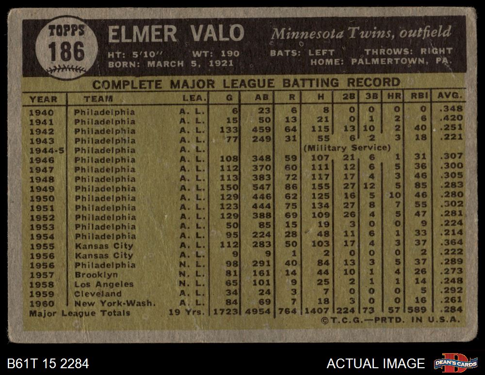 1961 Topps #186 May Have Border Break Elmer Valo 1.5 - FAIR