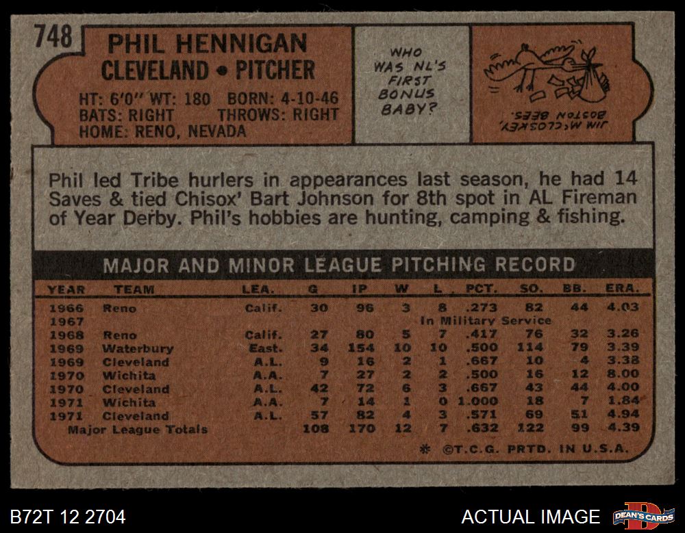 1972 Topps #748 Phil Hennigan 4 - VG/EX