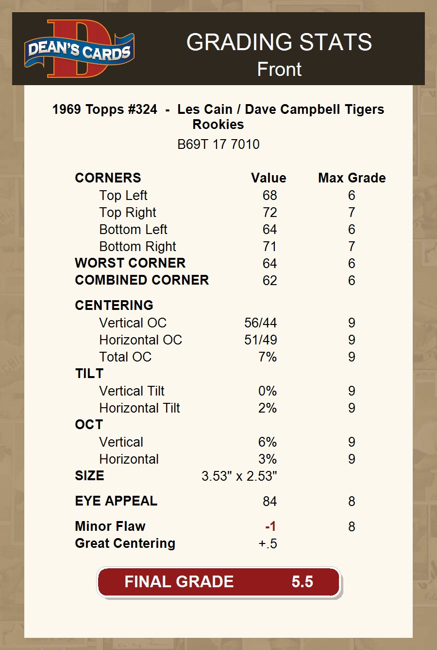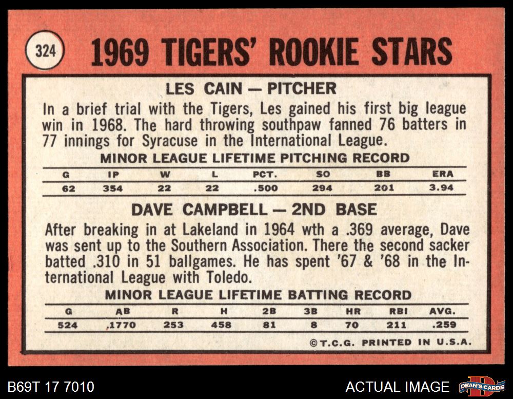 1969 Topps #324 - Les Cain / Dave Campbell Tigers Rookies 5.5 - EX+