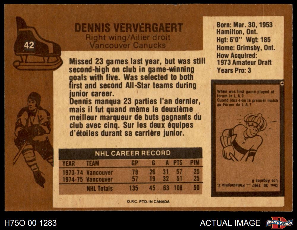 1975 O-Pee-Chee NHL #42 Dennis Ververgaert