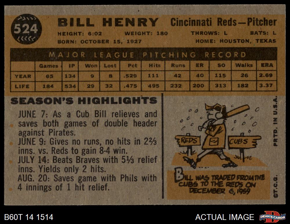 1960 Topps #524 Bill Henry 4 - VG/EX