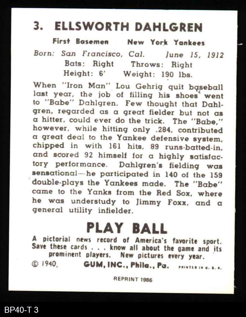 1940 Play Ball Reprint #3 Babe Dahlgren 8 - NM/MT