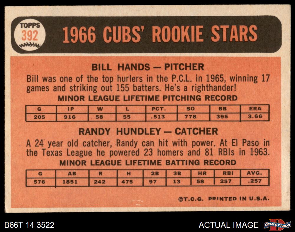 1966 Topps #392 - Randy Hundley / Bill Hands Cubs Rookies 5 - EX