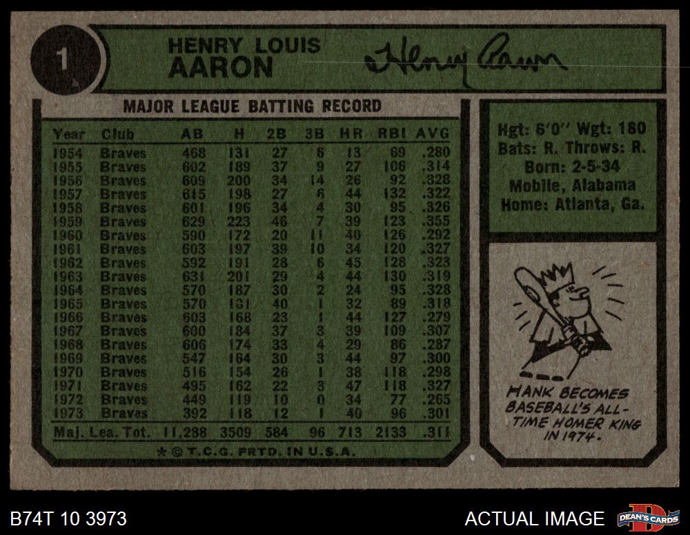 1974 Topps #1 - Hank Aaron New All-Time Home Run King 6.5 - EX/MT+