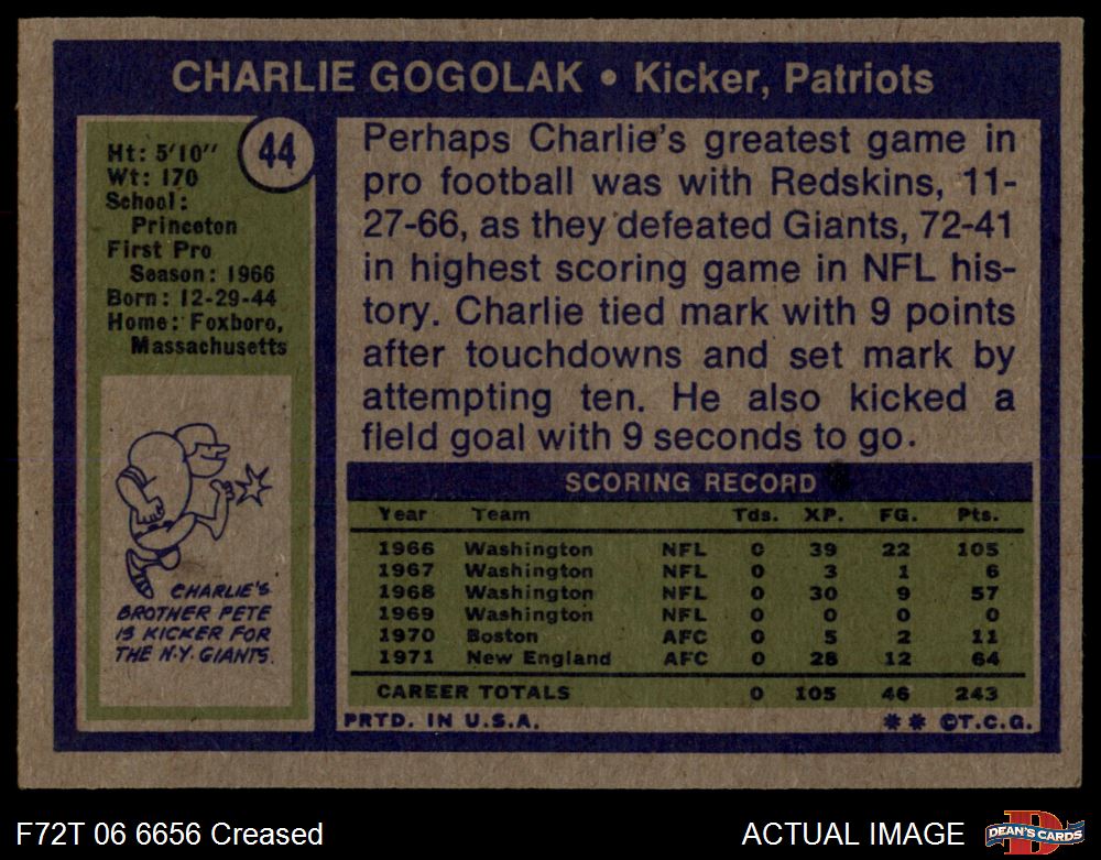 1972 Topps #44 Charlie Gogolak 3 - VG
