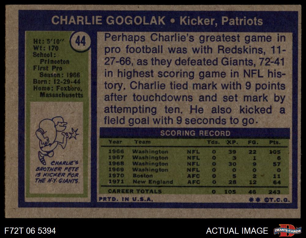 1972 Topps #44 Charlie Gogolak 4 - VG/EX
