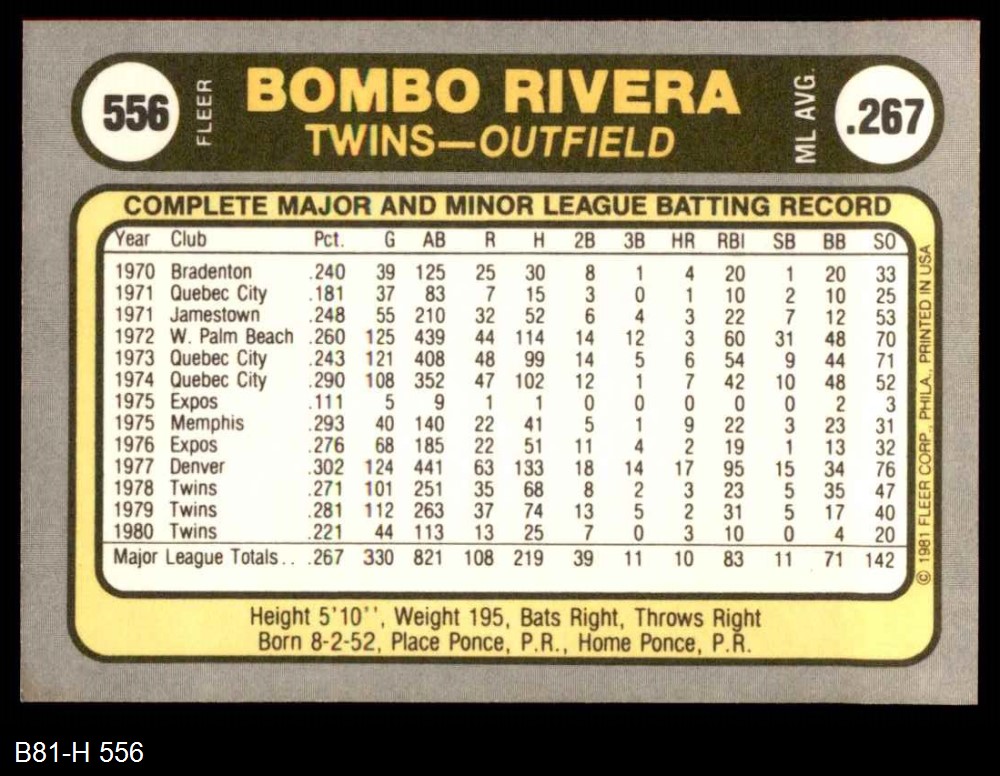 1981 Fleer #556 Bombo Rivera 8 - NM/MT