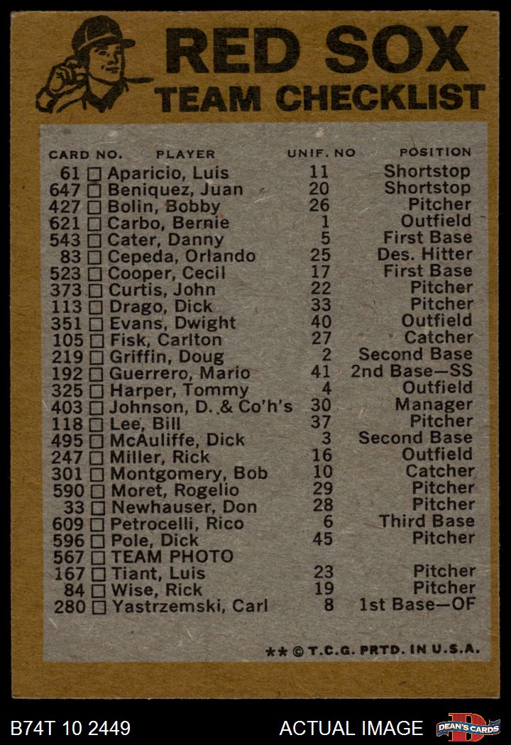 1974 Topps Boston Red Sox Red Team Checklist 3 - VG
