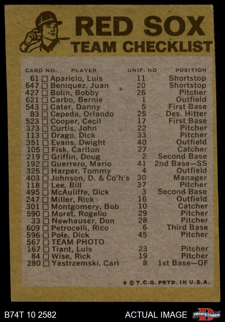 1974 Topps Boston Red Sox Red Team Checklist 4 - VG/EX
