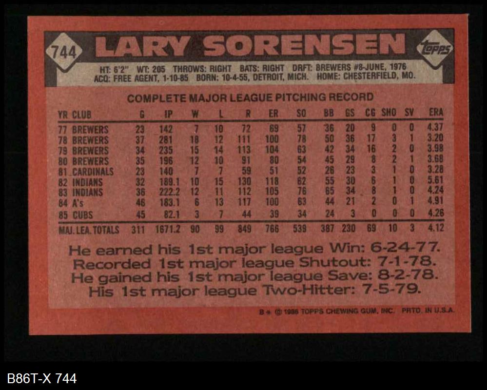 1986 Topps #744 Lary Sorensen