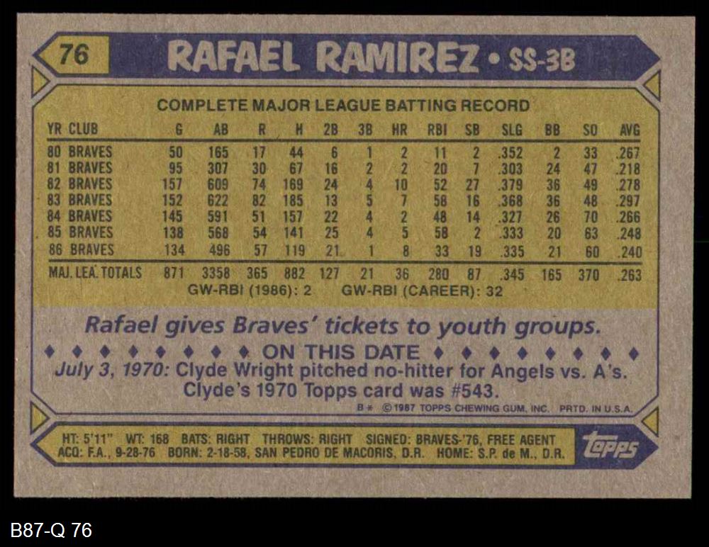 1987 Topps #76 Rafael Ramirez 8 - NM/MT