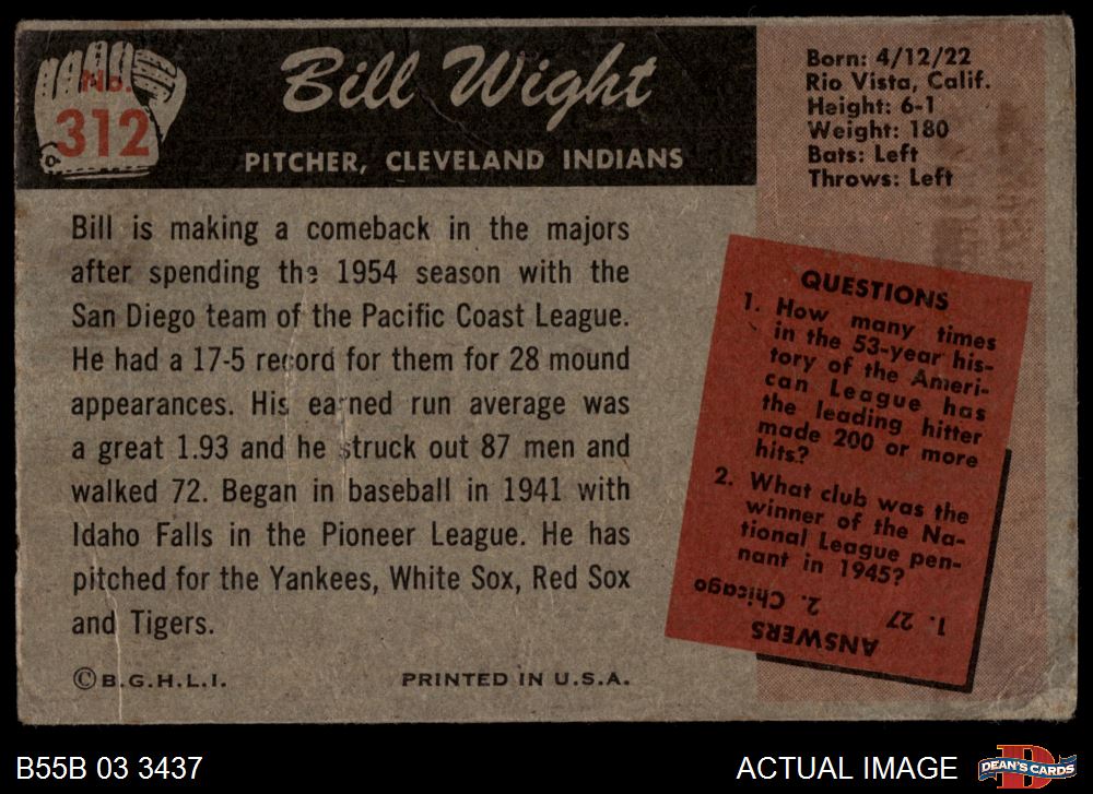 1955 Bowman #312 Bill Wight 1.5 - FAIR