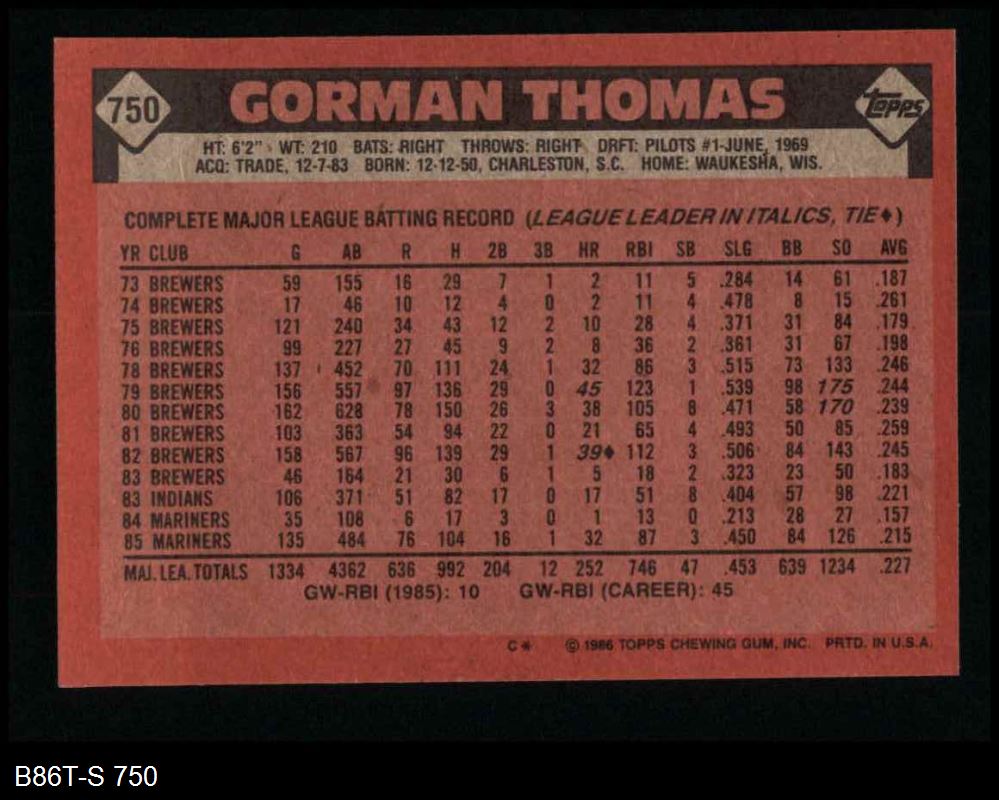 1986 Topps #750 Gorman Thomas
