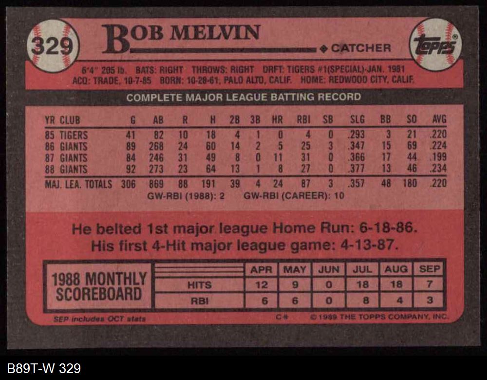 1989 Topps #329 Bob Melvin 8 - NM/MT