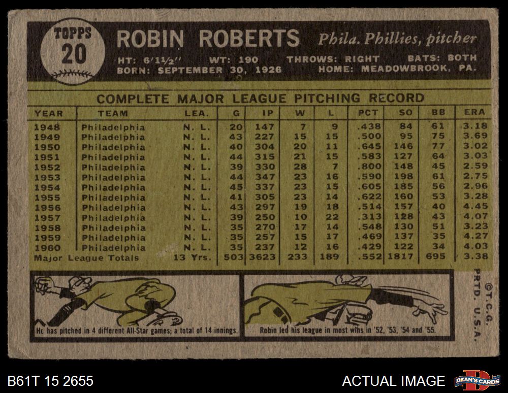 1961 Topps #20 Robin Roberts 1.5 - FAIR