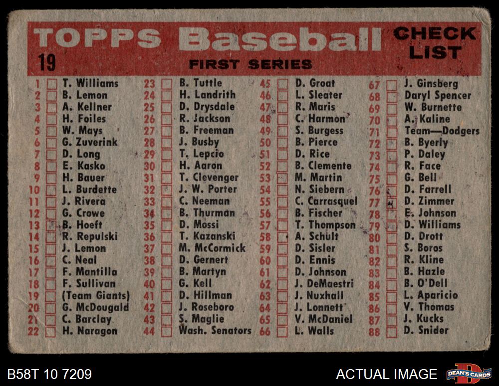 1958 Topps #19 Giants Team Checklist