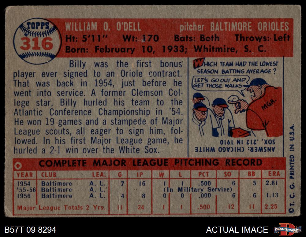 1957 Topps #316 Billy O'Dell 1 - POOR