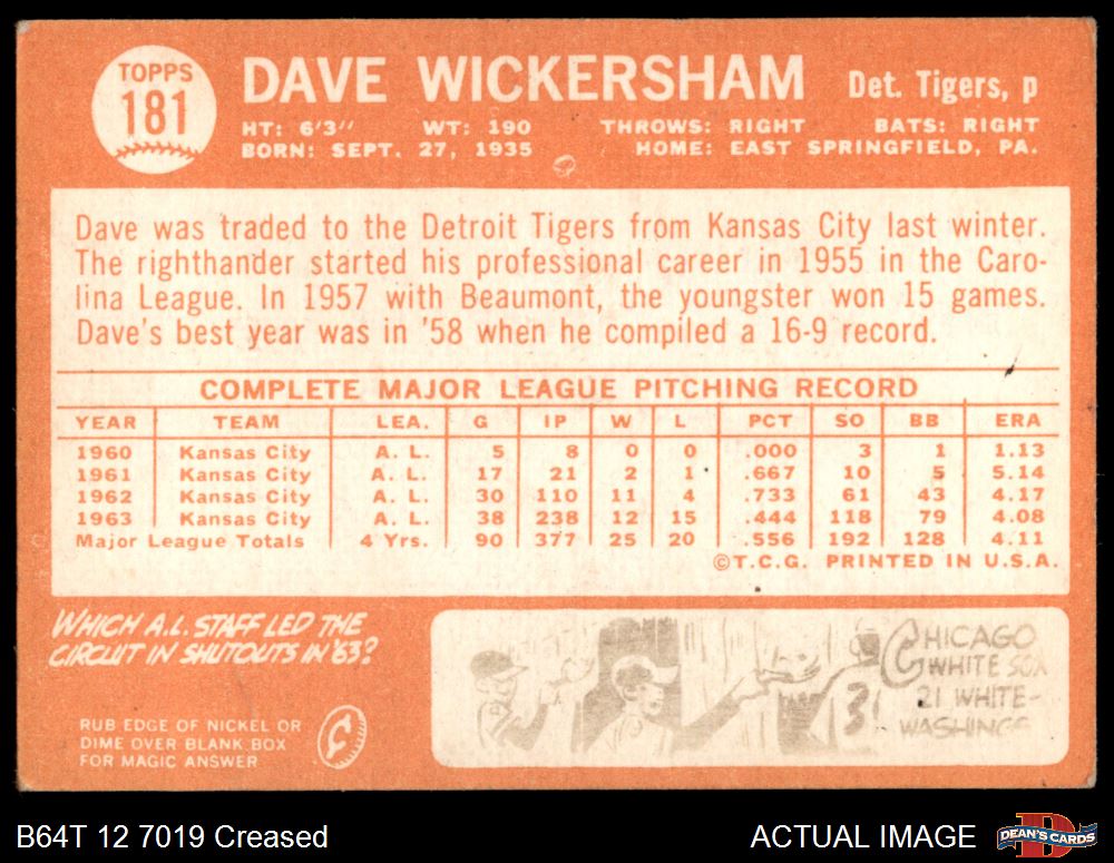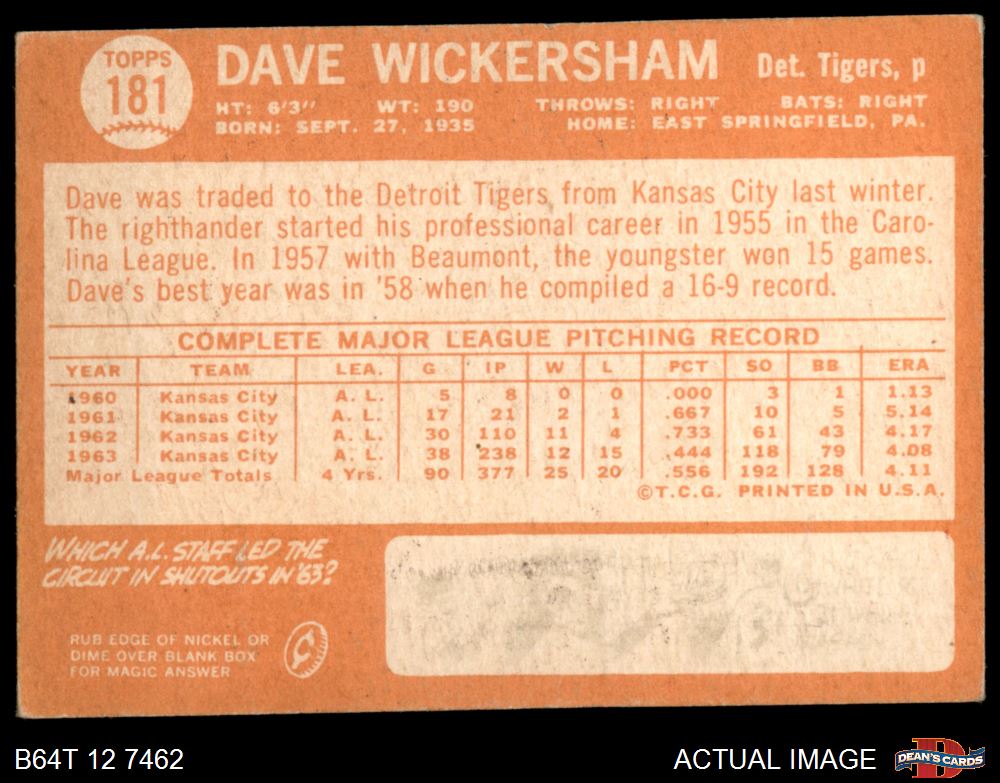 1964 Topps #181 Dave Wickersham 2 - GOOD