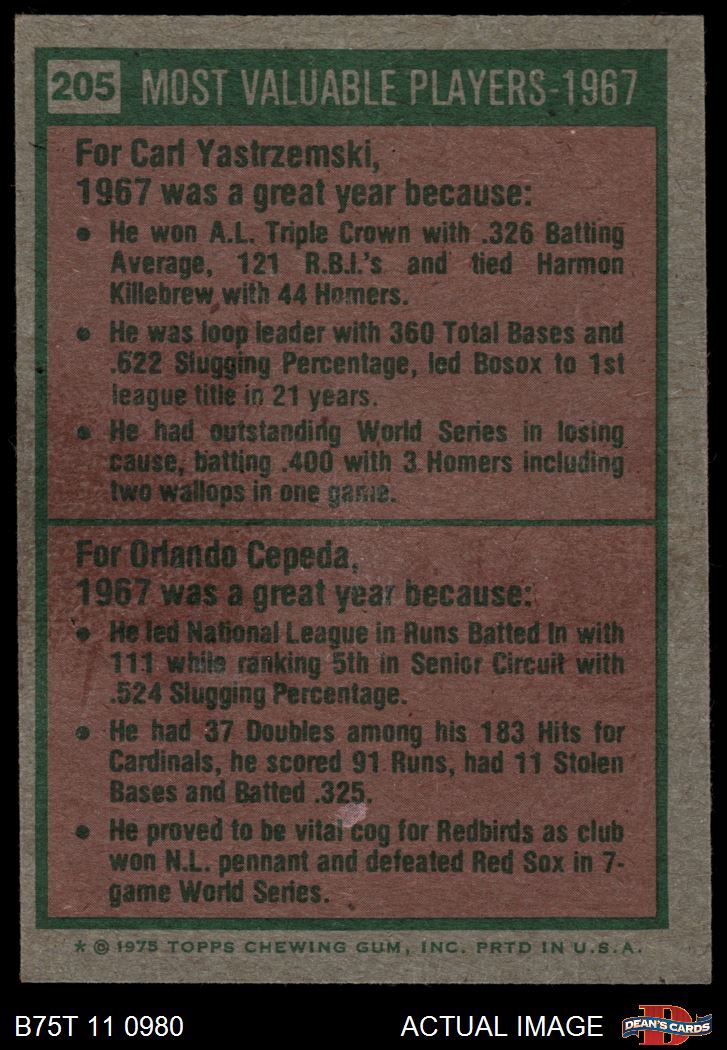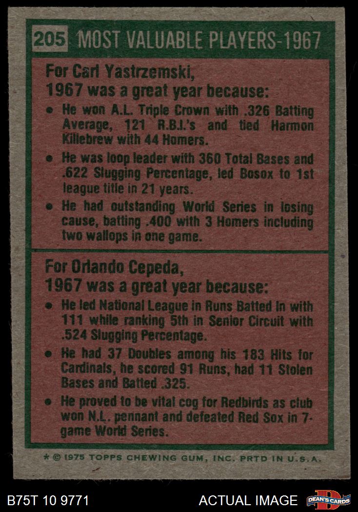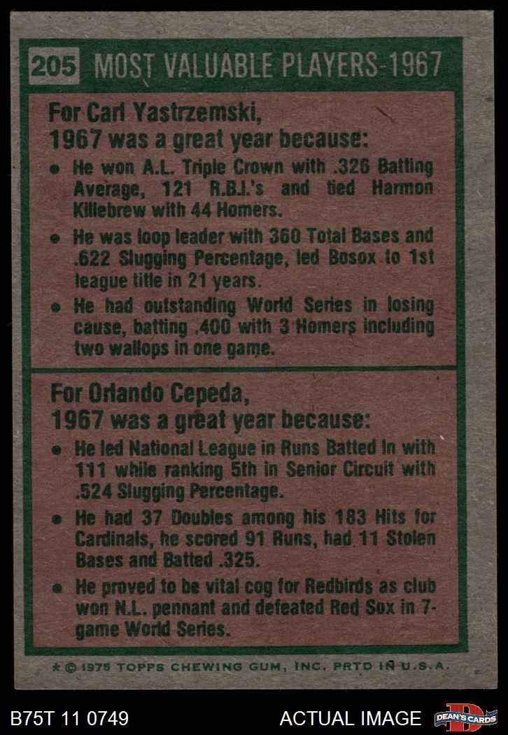 1975 Topps #205 - Carl Yastrzemski / Orlando Cepeda 1967 MVPs 5 - EX