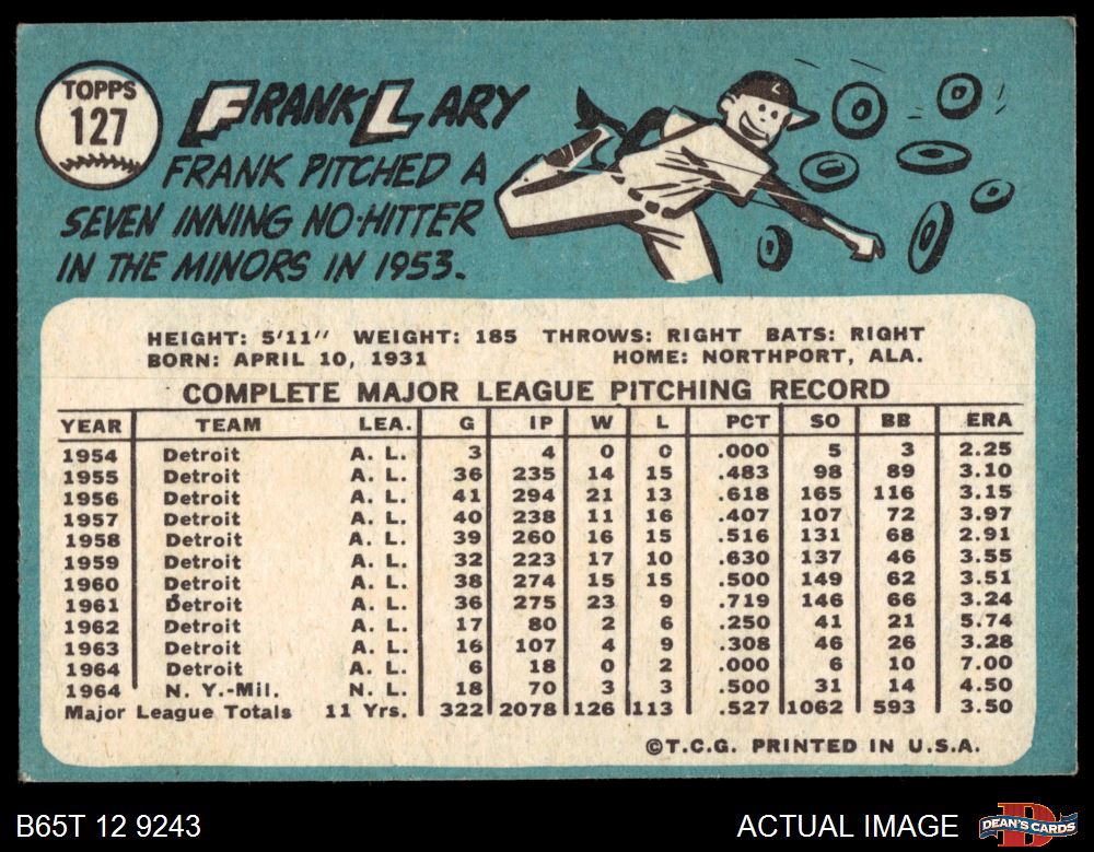 1965 Topps #127 Frank Lary 4 - VG/EX