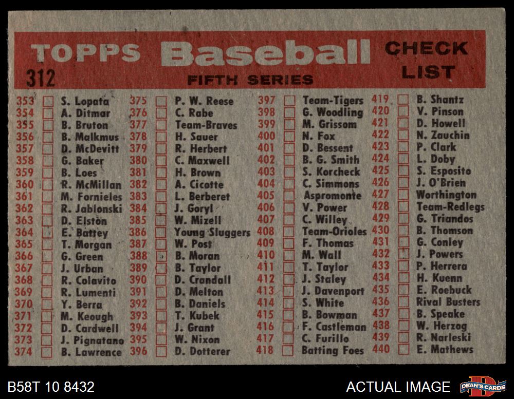 1958 Topps #312 Red Sox Team Checklist 4 - VG/EX