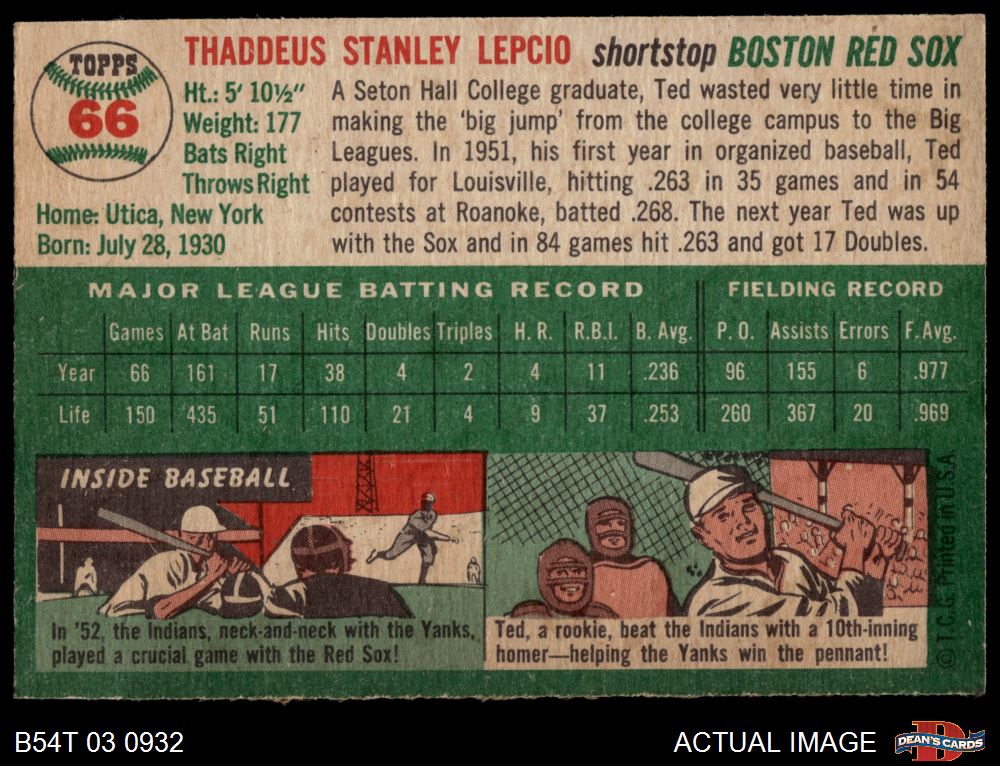 1954 Topps #66 Ted Lepcio 4 - VG/EX