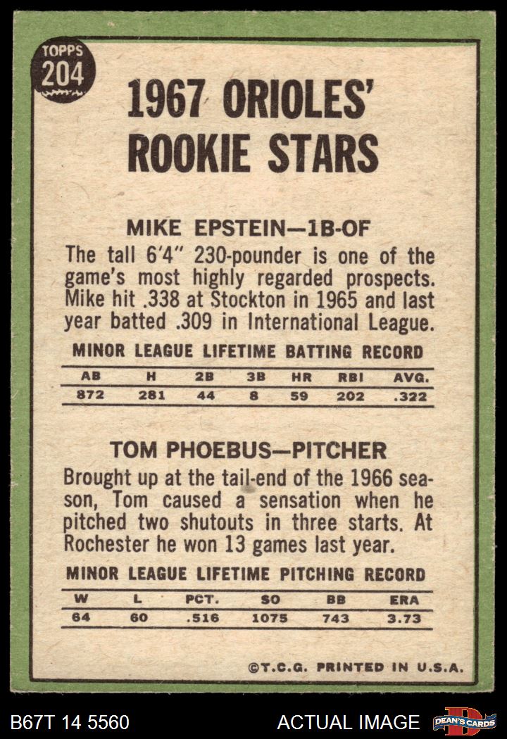 1967 Topps #204 - Mike Epstein / Tom Phoebus Orioles Rookies 5 - EX