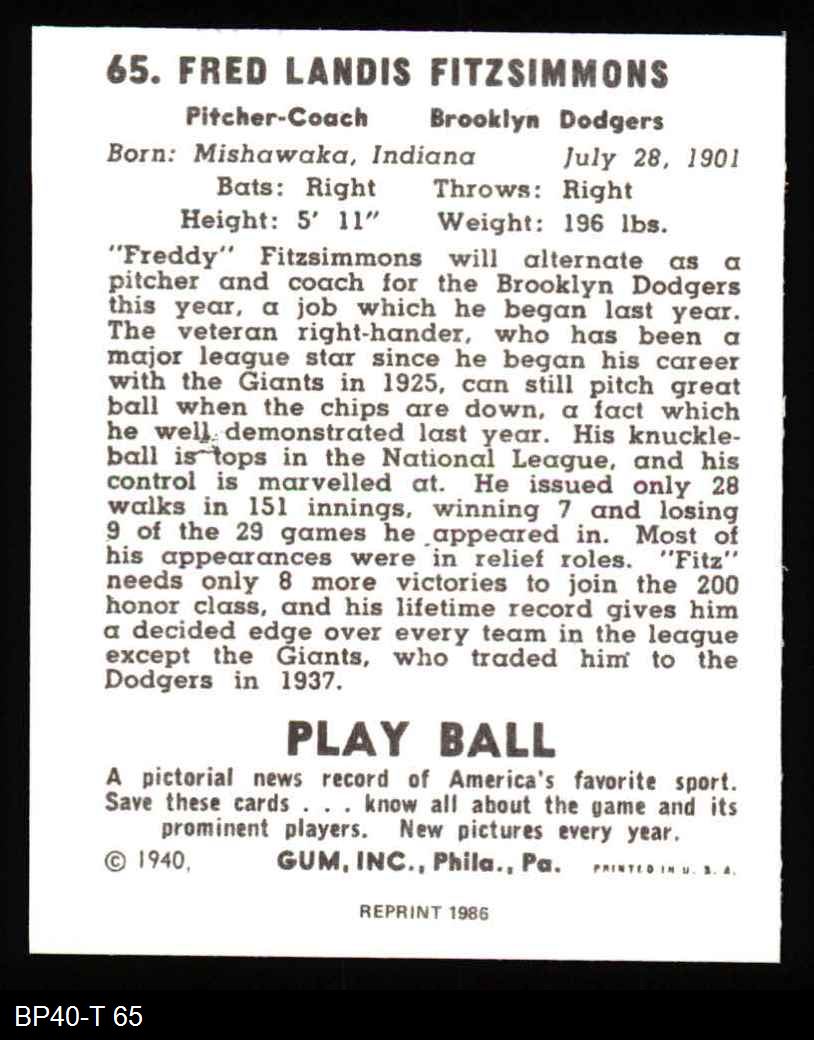 1940 Play Ball Reprint #65 Fred Fitzsimmons 8 - NM/MT