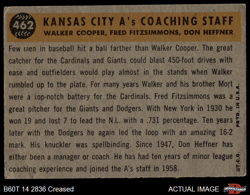 1960 1960 #462 - Fred Fitzsimmons / Don Heffner / Walker Cooper A's Coaches 1.5 - FAIR