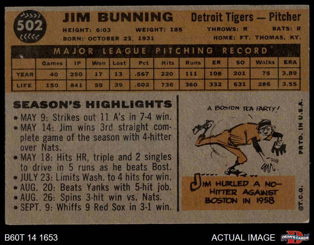 1960 Topps #502 Jim Bunning 4 - VG/EX