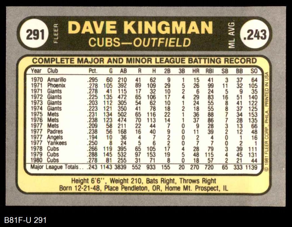 1981 Fleer #291 Dave Kingman 8 - NM/MT