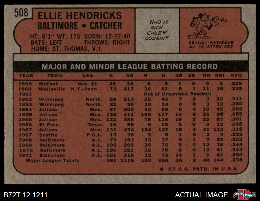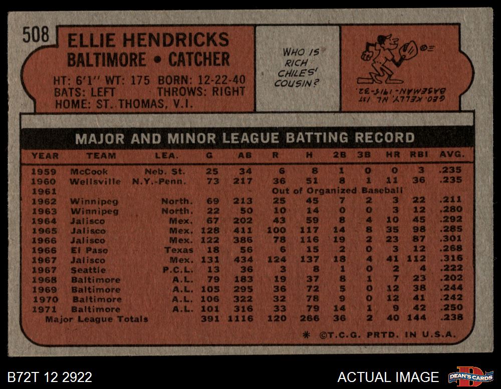 1972 Topps #508 Ellie Hendricks 3 - VG